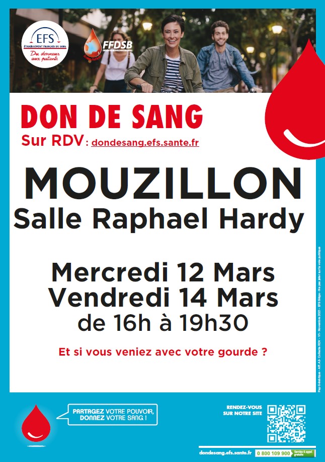 Don de sang à Mouzillon, salle Raphael HARDY, de 16h à 19h30. Rendez-vous obligatoire : Prendre rendez-vous