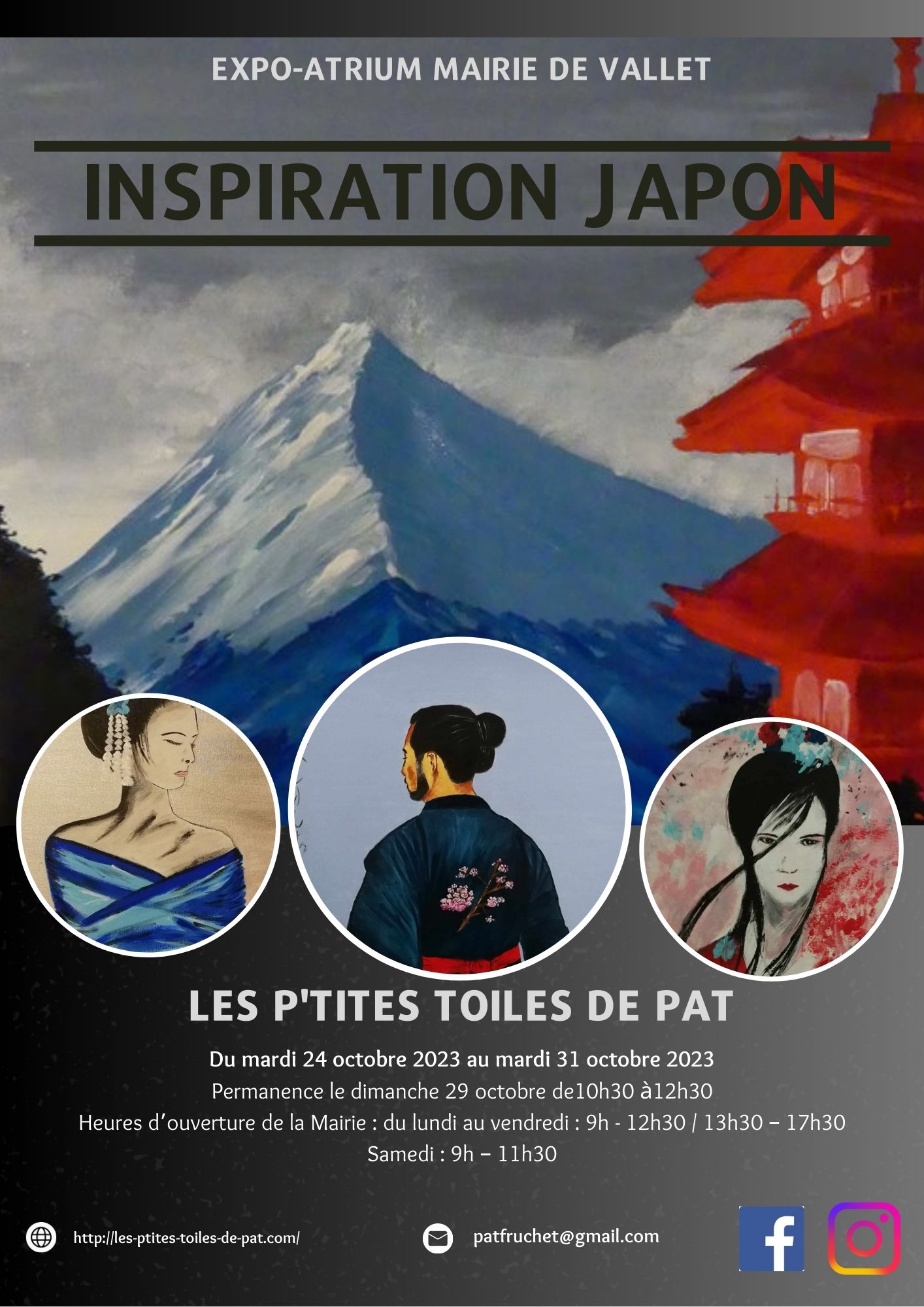 A travers ses peintures en aquarelle, encre et acrylique, Patricia FRUCHET, ou les p’tites toiles de Pat, vous emmène au pays du soleil levant. Une ballade apaisante et émotionnelle grâce à l’association des couleurs des tableaux.